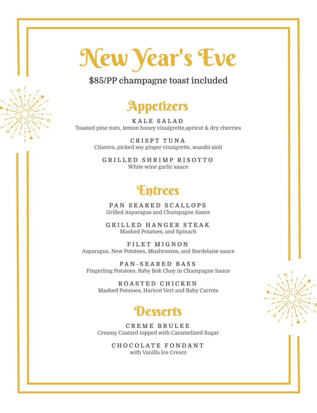 A four-course Italian NYE dinner featuring shareable starters, holiday mains (including Osso Buco and branzino), and a champagne toast to welcome 2026.