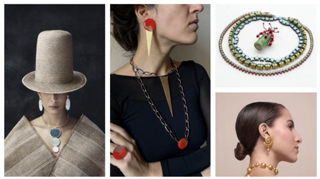 Jewelry works by MAD About Jewelry artists Sebastian Schildt (left), Valeria Molinari (center), Xinyi Chen (top right), and Cano Jewelry (bottom right). Images courtesy of the artists.