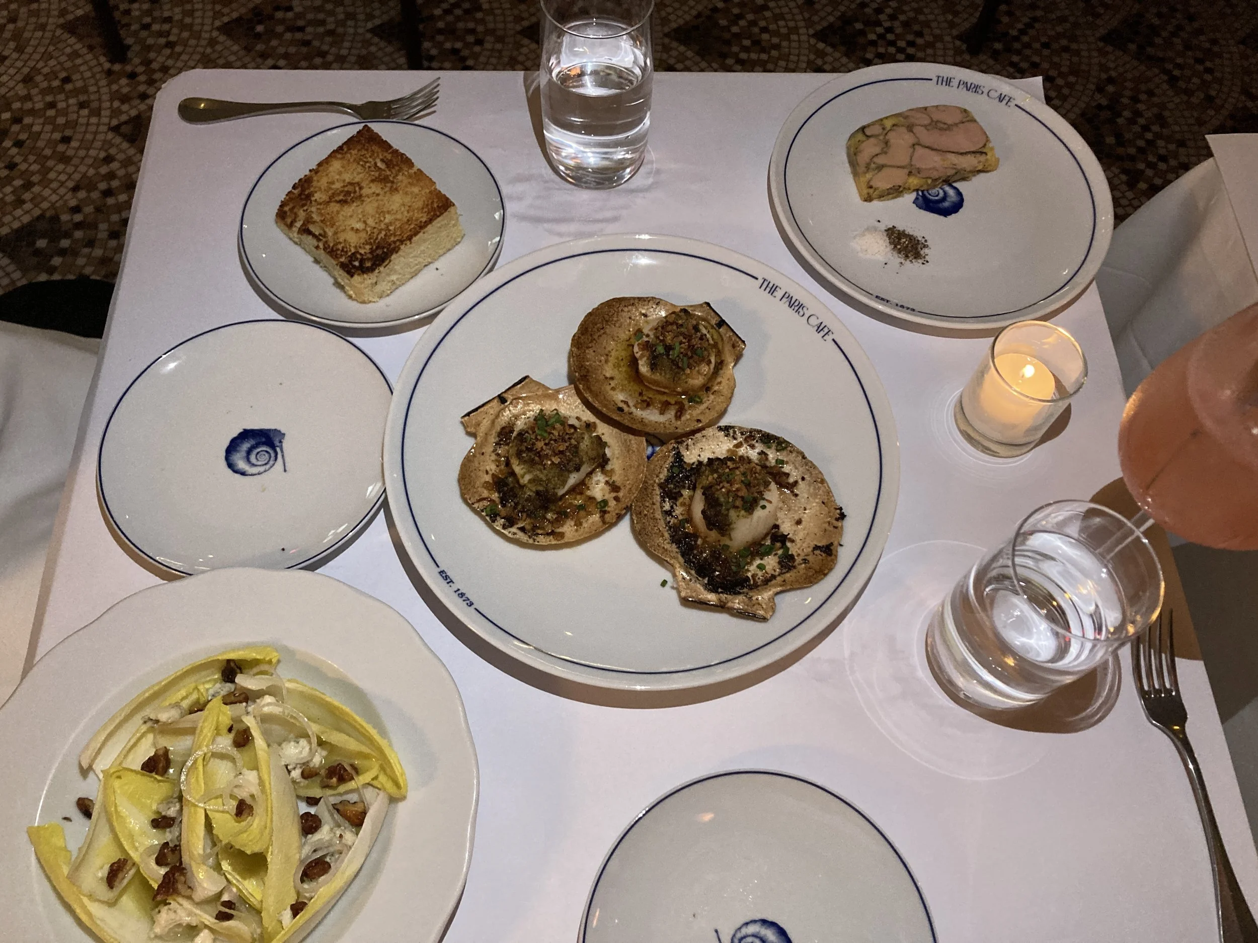 Our meal began with the bread service, and what a beginning it was, served warm with butter from Normandy that deserved a spotlight of its own. We also indulged in the Panier de Gougères: delicate, cheesy puffs that dissolved into pure decadence. For starters, we shared the Foie Gras Terrine with housemade brioche—slightly sweet, almost like cornbread—rich, silky, and indulgent. The Endive Salade was a study in balance: crisp, creamy, and punctuated with candied walnuts and Roquefort. But the true standout was the St. Jacques à la Paris Café—perfectly roasted diver scallops served in stunning shell presentations, topped with caper butter and crispy shallot breadcrumbs. Each bite was a buttery, texture-rich triumph.