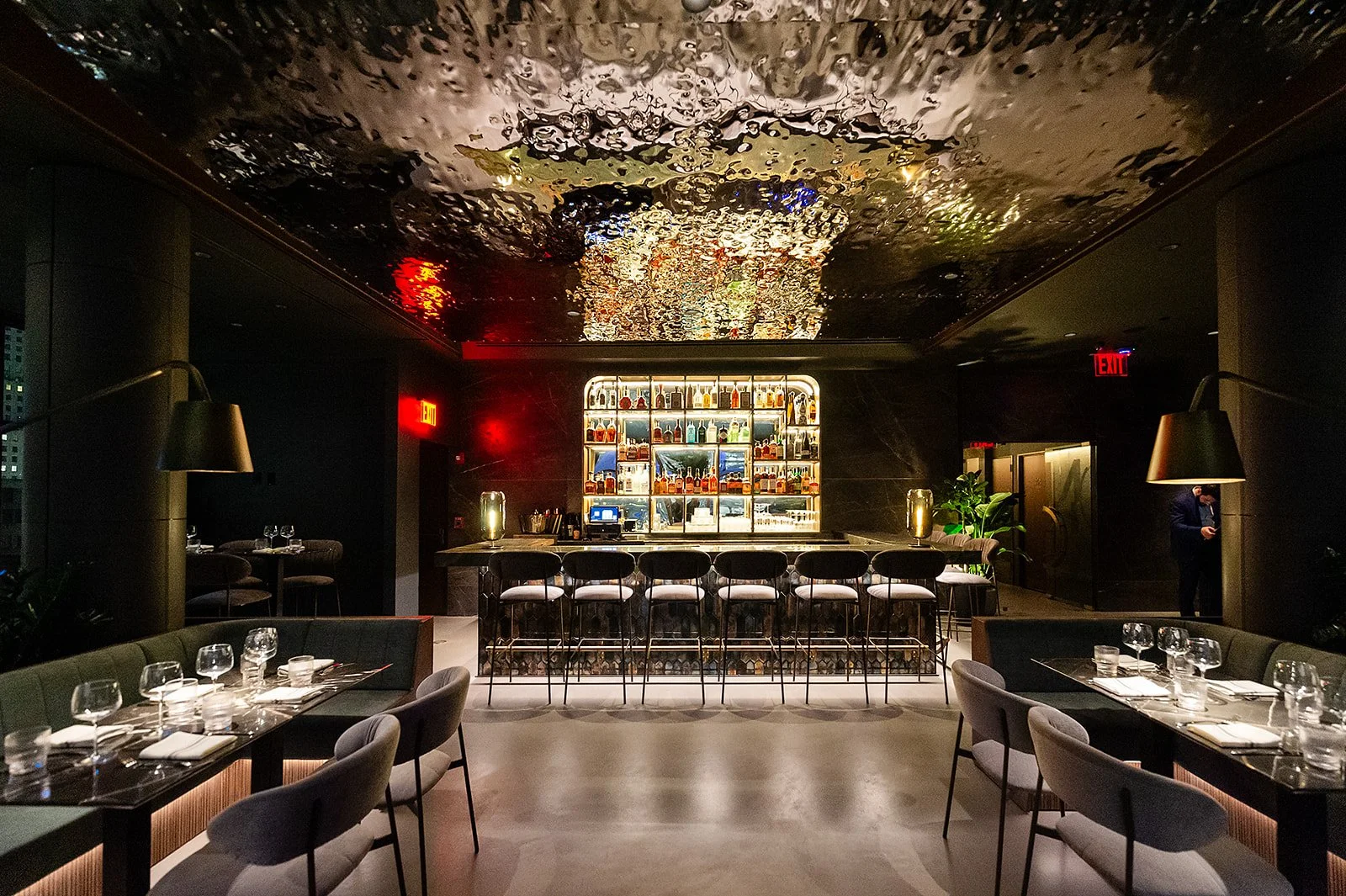 Designed by Abraham John Architects, the rooftop and interior restaurant make the most of their setting with sweeping views of Lower Manhattan and the Hudson River. The design balances modern architectural lines with softer natural elements, while the interior’s sculptural steel mural ceiling offers a subtle nod to nearby One World Trade Center. The result is a rooftop that feels polished without being overly formal, making it just as fitting for after-work drinks as it is for a longer dinner downtown.